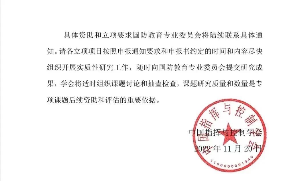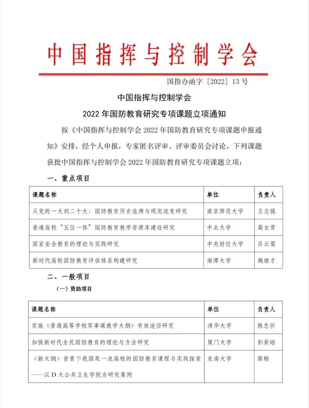 近日,中国指挥与控制学会发布了国防教育研究专项课题申报通知,经综合评审,国产高清在线精品一区二区三区李贵河的课题《军民融合式国防教育视域下普通高校“预备役制教育管理”与大学生思政工作融合式发展研究》获批一般课题。