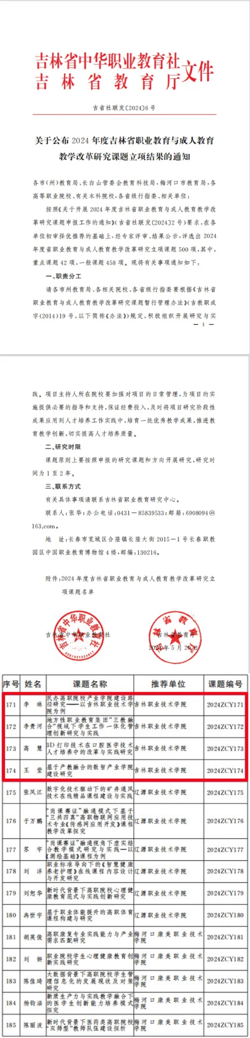 根据《关于开展 2024年度吉林省职业教育与成人教育教学改革研究课题申报工作的通知》(吉省社联发〔2024〕2号)要求,在各单位初审择优推荐的基础上,经专家评审、结果公示,评选出2024年度省职业教育与成人教育教学改革研究立项课题。