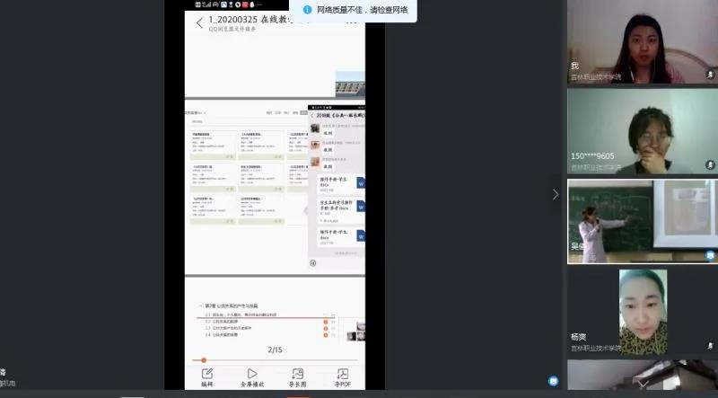 每个老师特点不同、学生情况不同、学科不同、资源有限、主客观条件不同,不必copy,找到最适合自己、最适合自己学生、最适合课程的教学模式就是最好的模式、最好的工具。二是过程性评价不同于课堂教学。对此,评价考核内容可以分为课前、课中和课后三部分:课前:每次课上课之前进行签到,没有及时签到的同学须写一个情况说明,老师及时掌握同学没签到的原因,老师做好每堂课的考勤记录。课中:建立QQ课堂群,在上课时随时与学生连麦,确保学生正在认真听课;在学习通上随时进行测验,检查学生学习情况。课后:每天让同学们将课程笔记拍照发给老师;每节课留作业,检查学生对知识点的掌握情况。三是采取了新的教学方法,分别为QQ直播课和PPT录屏。QQ直播课可以更好的与学生互动,了解学生学习情况,但是对于网速要求比较高。PPT录屏由于是自己的任课老师上课,学生上课积极性更高,并且录制完的视频可以一直放在平台上,学生们可以重复观看。但是文件上传有一定限制。