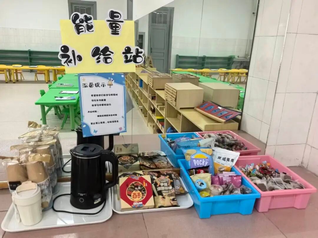 “能量补给站”以“学习需要能量,奋斗更需补给”的理念为核心,精确保障了学前教育专业学生高强度的实训需求。站内配备了驱寒的热水壶与温馨水杯,同时备有饼干、坚果等缓解疲劳的小食品。学前教育专业的同学表示:“实训课上需要不断练习操作技巧,体力消耗较大,另外有时会有不吃早饭出现低血糖的情况,看到老师精心准备的补给站,感到非常惊喜。”补给站带来的不仅是物质上的支持,更让学生们深切感受到了老师的细致关怀。闫莉老师表示:“蒙台梭利教育强调环境对学习者的支持作用,这座补给站不仅是物质上的补给,更是精神与情感的鼓舞。”徐萌老师也补充说,希望通过这样的举措,让学生们在体验专业温暖的同时,深化对“教育即生活,生活即教育”理念的理解。