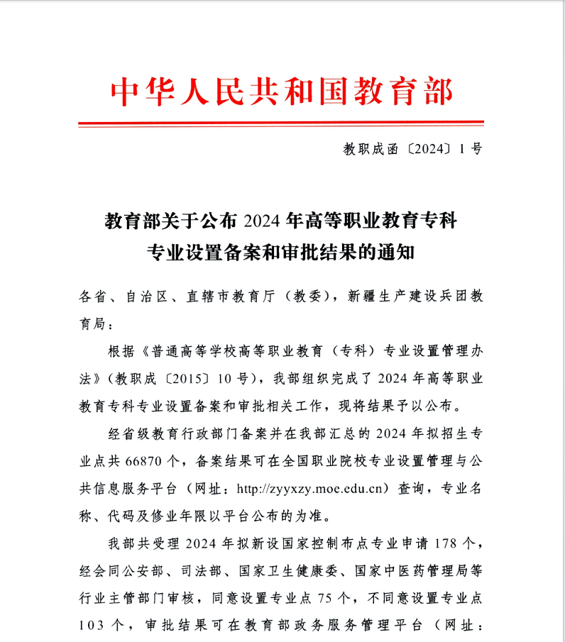 (记者 杨晓明)近日,从《教育部关于公布2024年高等职业教育专科专业设置备案和审批结果的通知》(教职成函〔2024〕1号)中获悉,我校申报的中医学专业成功获批。