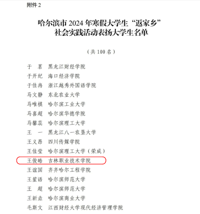 近日,共青团哈尔滨市委员会发布了《哈尔滨市2024年寒假大学生“返家乡”社会实践活动总结通报结果公示》我校22级电气自动化1班王俊皓荣获哈尔滨市2024年寒假大学生“返家乡”社会实践活动优秀大学生。