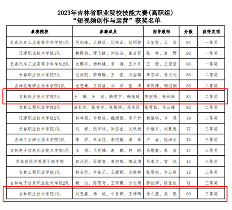 5月22-23日,吉林省职业技能大赛“短视频创作与运营”赛项在长春汽车工业高等专科学校举行。来自我省的18支代表队经过长达5个小时的激烈角逐,由我校教师陈宏亮、张林琳带队指导,学生王琳、王词、韩思宇、韩佩琦组成的队伍荣获二等奖;由我校教师徐久莹、吴限带队指导,学生刘思嘉、杨 斌、牛誉桦、王靖琦组成的队伍荣获三等奖。