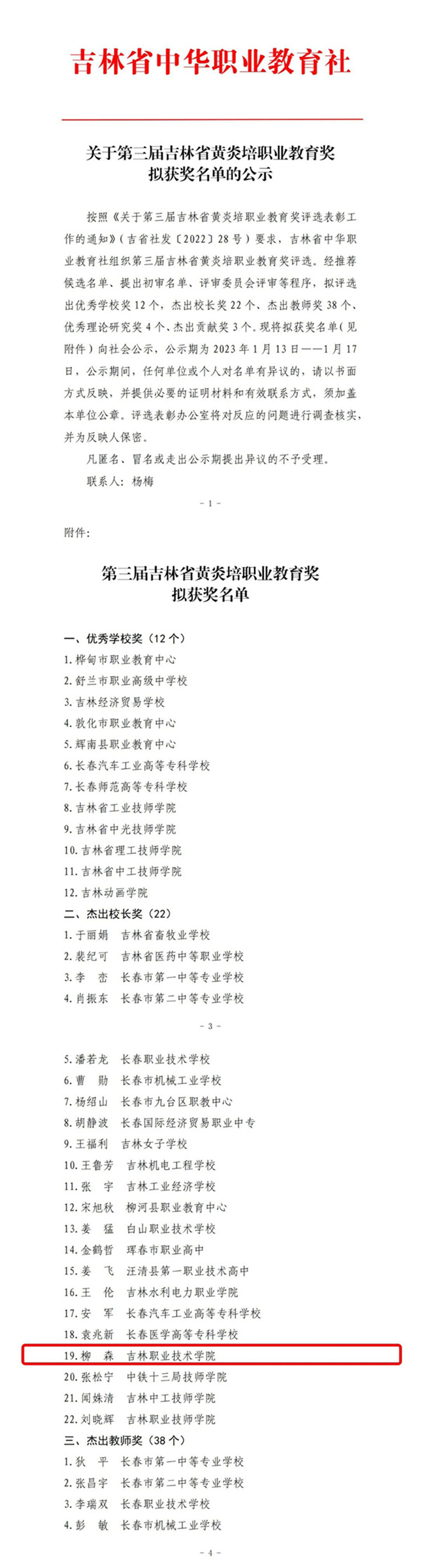 黄炎培职业教育奖是由中华职业教育社创立,经国务院专项审核通过的职业教育领域重要奖项,本届吉林省黄炎培职业教育奖在全省评选优秀学校奖12个,杰出校长奖22个、杰出教师奖38个、优秀理论研究奖4个、杰出贡献奖3个。
