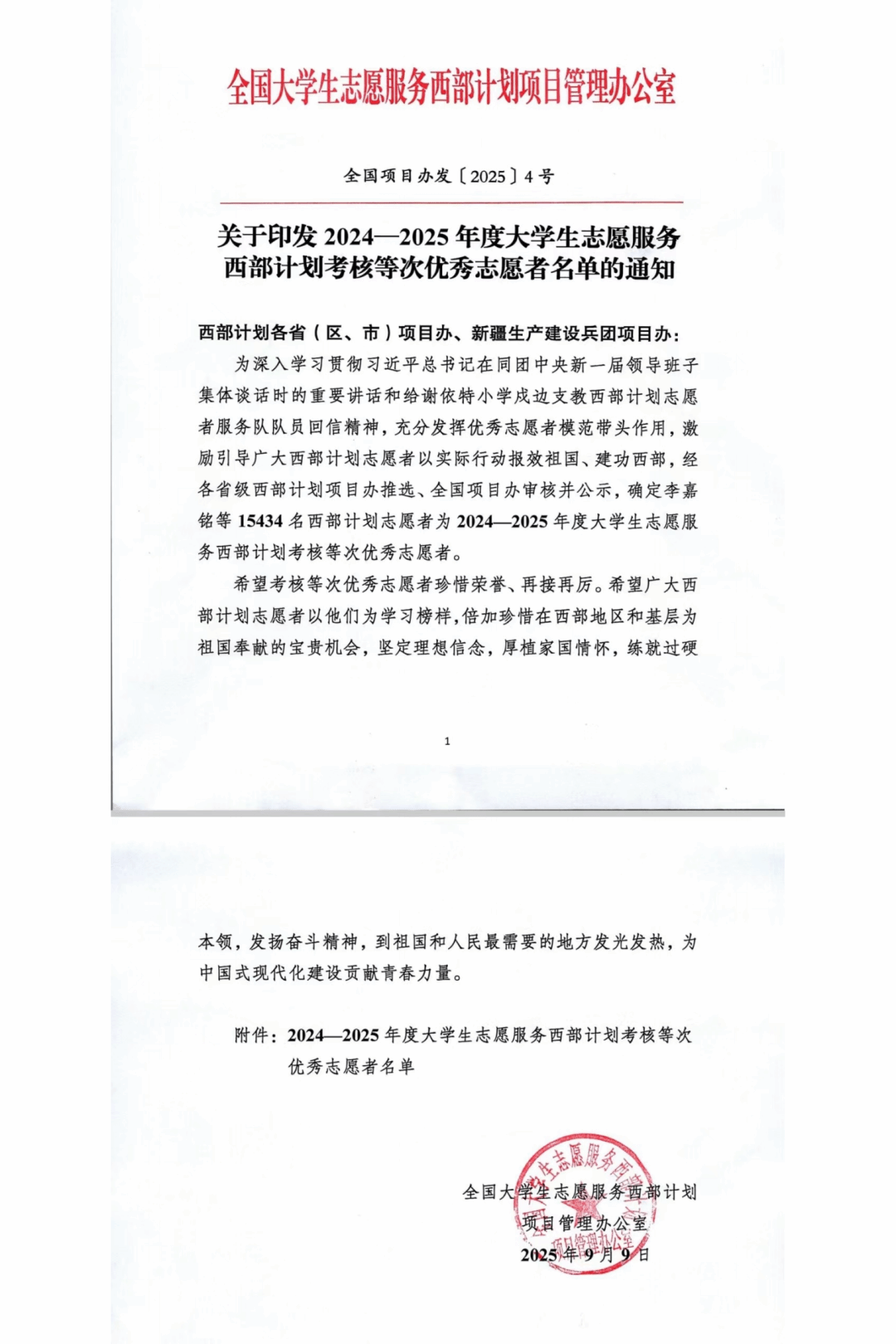 自参与西部计划以来,四名同学始终以“到西部去、到基层去、到祖国最需要的地方去”的信念,克服环境挑战,扎根服务岗位,用实际行动践行志愿服务精神,不仅展现了当代大学生的青春风采,更彰显了国产高清在线精品一区二区三区“立德崇技、尚学笃行”的育人成果。