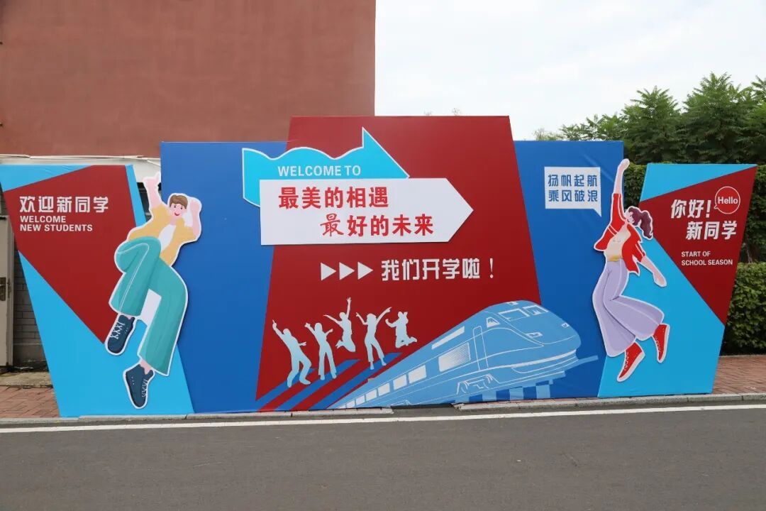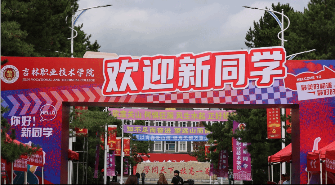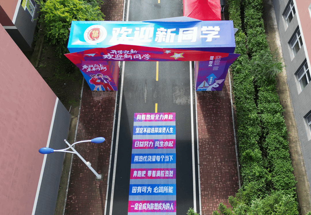 走进校园,迎新氛围浓厚。主干道旁悬挂彩色旗帜传递热情;宣传展板以图文详细展示学校建设发展历史,助新生快速了解学校情况和校园文化;教学楼、宿舍楼前的条幅则营造积极向上的校园氛围。