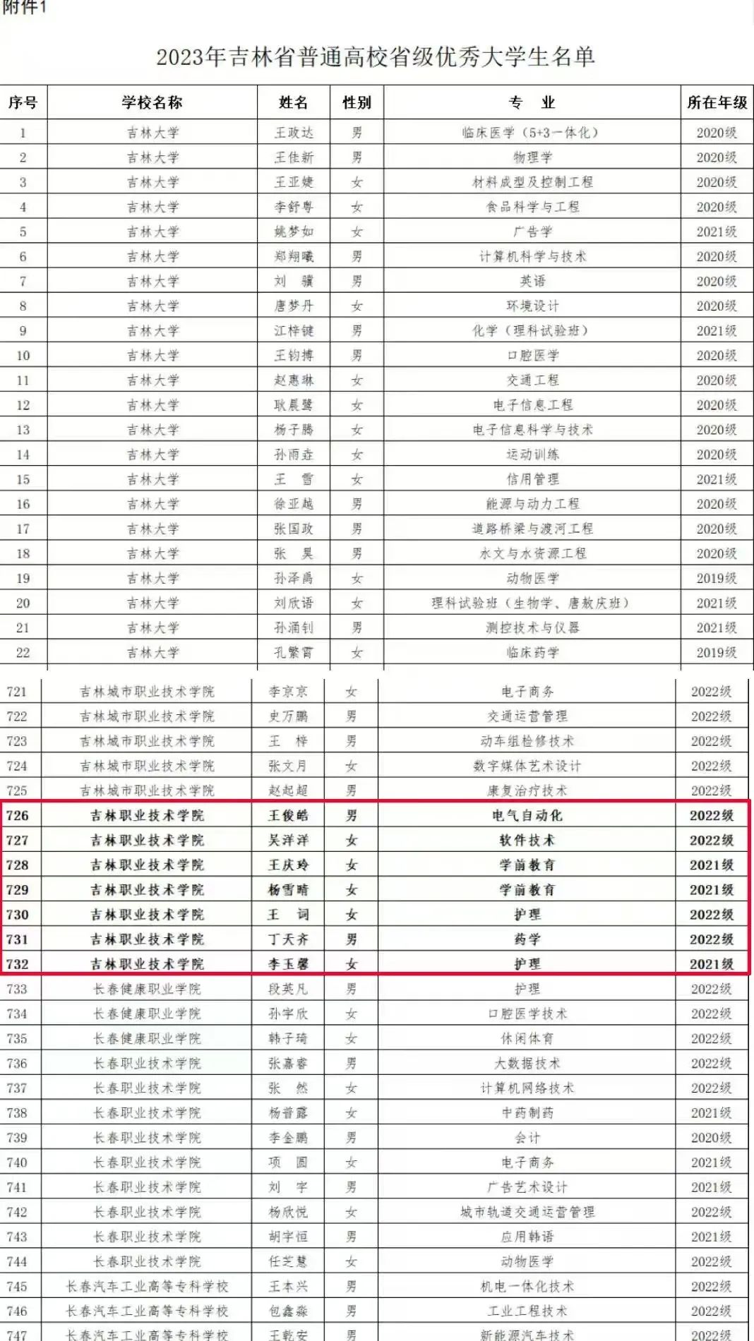 吉林省教育厅发布《关于公布2023年吉林省普通高校省级优秀大学生(标兵)、优秀学生干部(标兵)和先进班集体名单的通知》,我校电气自动化专业王俊皓等7名同学获评“吉林省优秀大学生”,口腔医学技术专业李春磊等2名同学获评“吉林省优秀学生干部”,2022级运动训练1班等2个班级获评“吉林省先进班集体”。