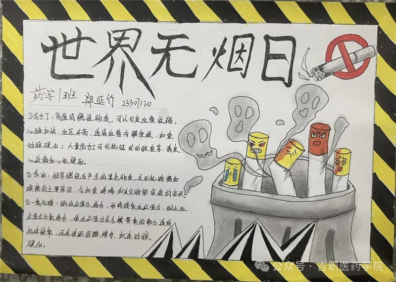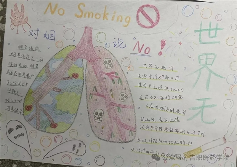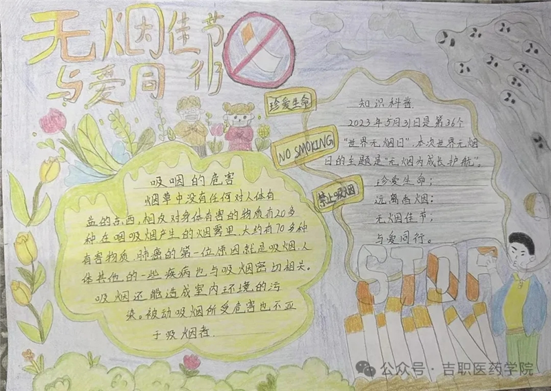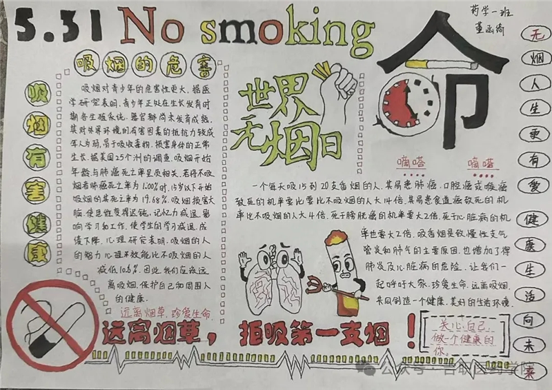 为了进一步增强同学们对吸烟危害健康的认识,了解到禁烟也是保护环境的一项重要措施,为有效创建健康和谐的校园环境起到很好的促进作用,医药学院组织部于5月30日展开以“世界无烟日”为主题的手抄报评比活动。