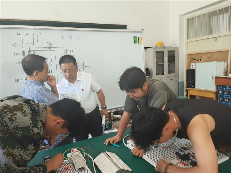 课堂上,陈老师将生产生活实际应用和电机与电气控制实训课程内容相结合,通过实训设备演示讲解控制原理。他根据现有实训器材合理分组,组织同学们实际操作,针对出现的问题进行解答。整堂课教学组织严密有序、寓教于乐,教师语言表达简练清晰、形象生动,实训内容符合培养目标要求,操作示范标准规范。